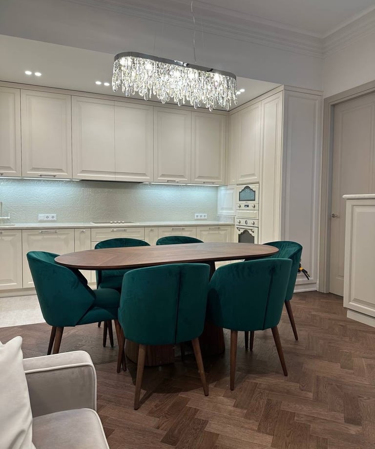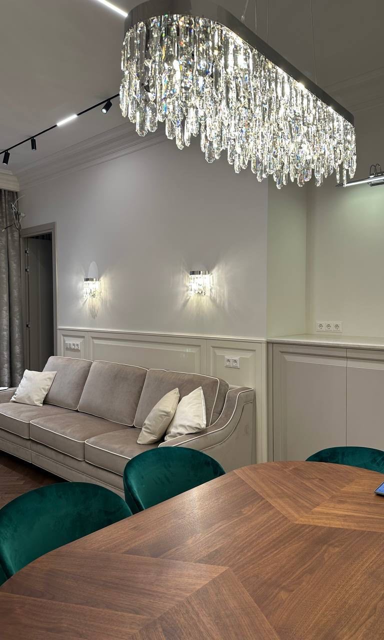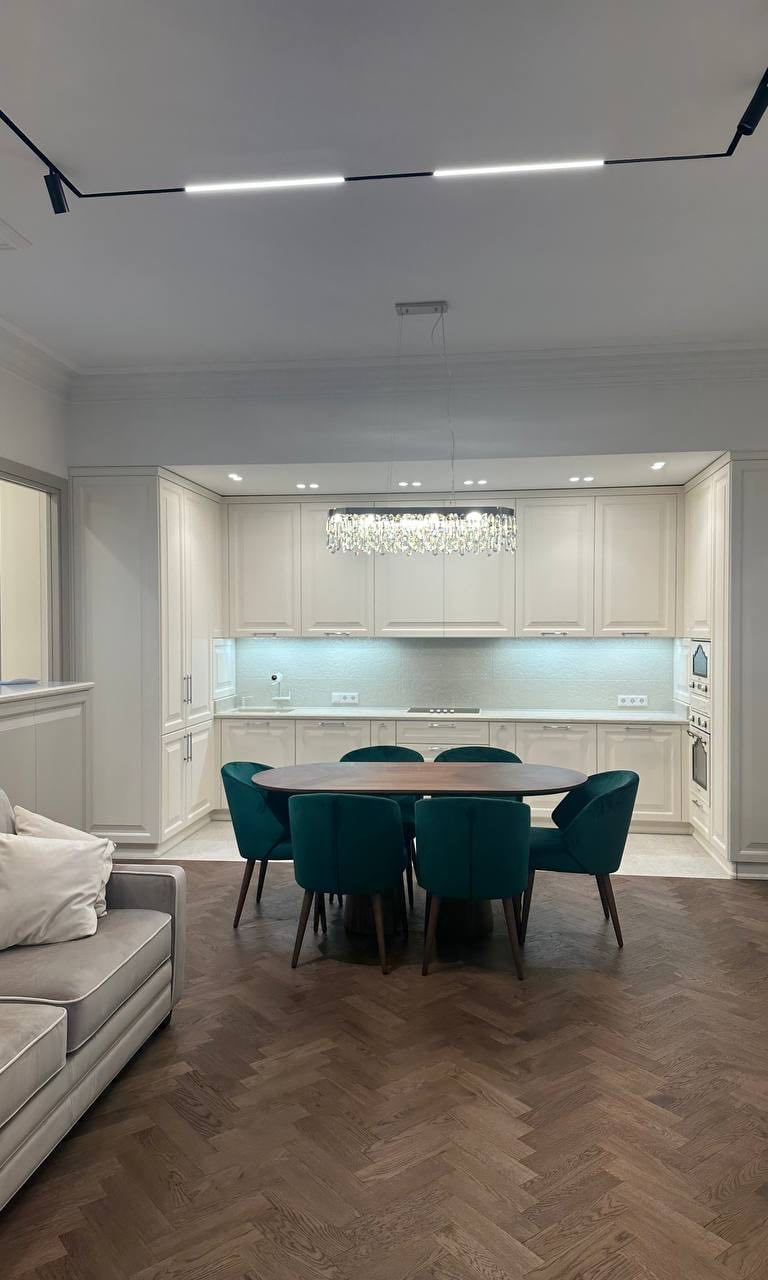Parisian-inspired interior blends classic architectural detailing, elegant furnishings, and soft lighting to create a refined yet welcoming retreat. Crystal accents, tailored millwork, and rich textiles bring depth to the neutral palette, while custom elements enhance both beauty and everyday comfort, resulting in a space that feels timeless, luminous, and effortlessly livable.